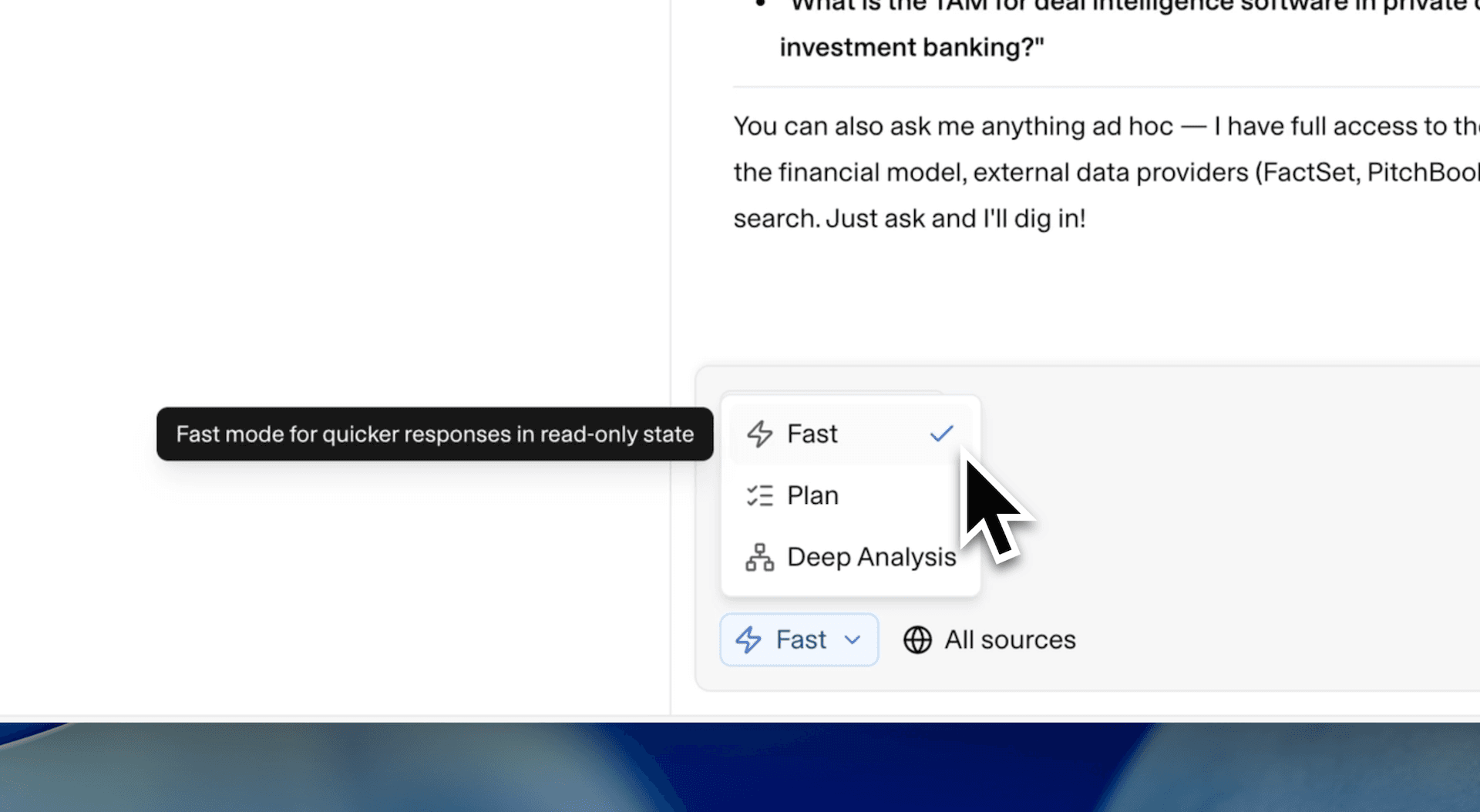Not every question needs a full diligence run. Fast Mode delivers immediate answers for quick lookups, sanity checks, and follow-up questions. F2 now adapts to the complexity of your question: Fast Mode for quick answers, Deep Analysis for comprehensive audit-ready work, and Plan Mode for structured multi-step execution. Match the mode to the task.